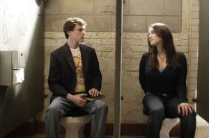 In one of the first scenes, the school bully Murphey [Tyler Hilton] encounters him in the bathroom and asks “Is that a briefcase?” to which Charlie responds, “No, it’s actually an attaché.” Murphey proceeds to beat him up, complete with a head dunk in the toilet. Charlie also gets teased by the popular kids and stared out by the theater types. A cool, dark-haired arty girl—one of the theater bunch—immediately takes notice of him (okay, maybe it’s a bit cliché that we soon discover her dad (a funny, neurotic Robert Downey Jr.) is principal and we can just tell they are going to get together.