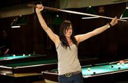 When he introduced the film at this year’s Independent Film Festival of Boston, writer/director Chris Eigeman said, “If handmade is the opposite of corporate, I hope this feels handmade.” It does. It has its charms. Eigeman starred in the Wilt Stilman trilogy: Metropolitan, Barcelona and The Last Days of Disco. He’s very good at playing the buttoned-up, upper crust preppie type. So it’s somewhat surprising that he wrote and directed a film like Turn the River. But then again not that surprising as in those films, the characters drew the interest. Turn the River is a character study. Eigeman met Famke Janssen when they starred in the indie In Treatment together. Eigeman wrote the character in Turn the River specifically for Janssen. That tells a lot about her acting talent. She’s a tall, beautiful woman, yes. If you’ve only seen her in the X-Men films, you are missing out. She’s fantastic in little films like Monument Ave. and Love and Sex. [I’d love to see a film with Janssen and Elizabeth Hurley playing sisters.] While effortlessly beautiful and cool, Janssen can delve into nearly any role with conviction. She’s fearless. And there’s no Charlize Theron-technique of hiding her beauty to play serious roles either. Those beautiful, expressive eyes carry her character through this film. She turns in a gritty, natural performance as a pool hustler mom in Turn the River.