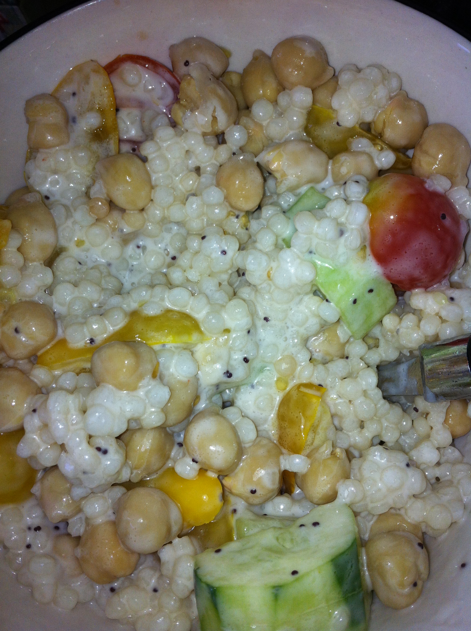 super easy and yummy. cook couscous. add grape or cherry tomatoes, chopped cucumber and chickpeas. I add poppy dressing but any dressing works.